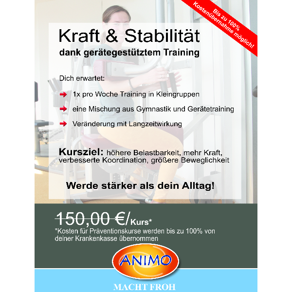Kraft & Stabi ist unser NEUER Präventionskurs, bei dem Gymnastik und Gerätetraining in ausgeglichener Weise zusammentreffen. Unsere Trainerin Sarah leitet euch dabei profesionell an. Die Kosten des Kurses können bis zu 100% von den Krankenkassen übernommen werden. Alle Infos bekommst du an unserer Rezeption.